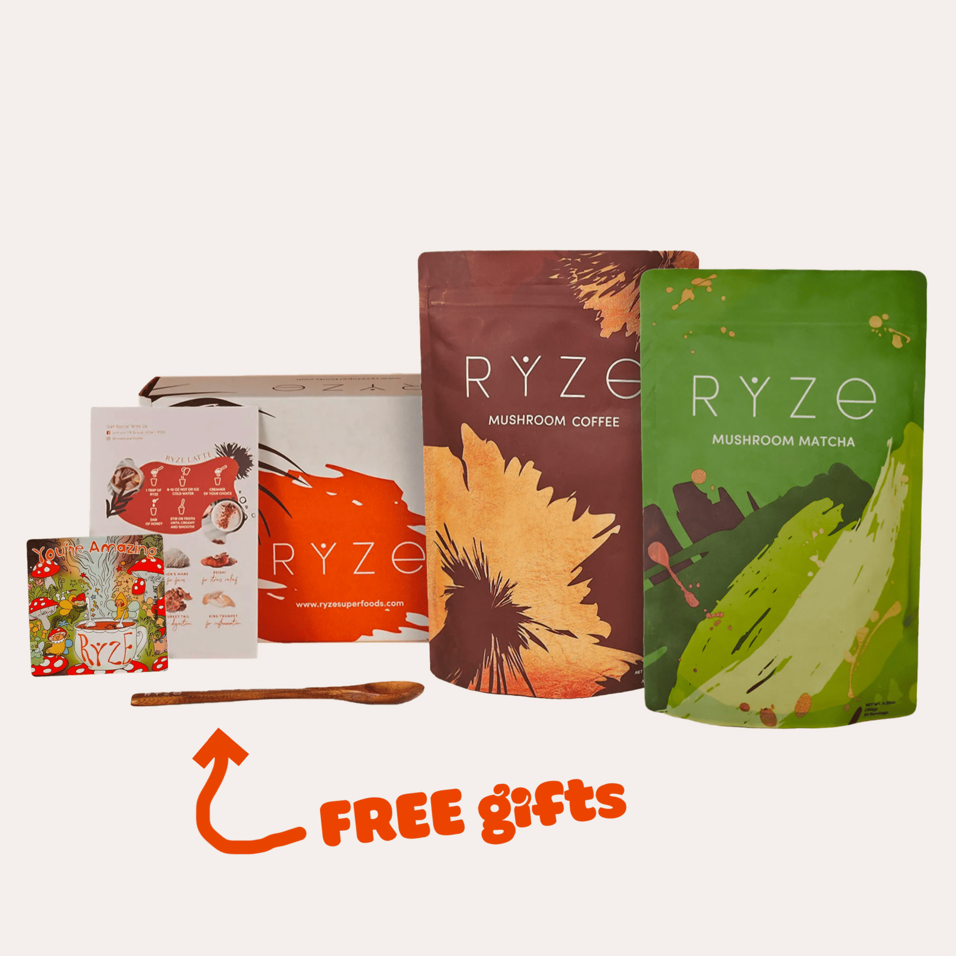 RYZE All Day Energy Bundle combines our top selling products Coffee & Matcha to keep your energy high all day - while also healing your gut. Now in this limited time BIG bundle for BIG savings!
