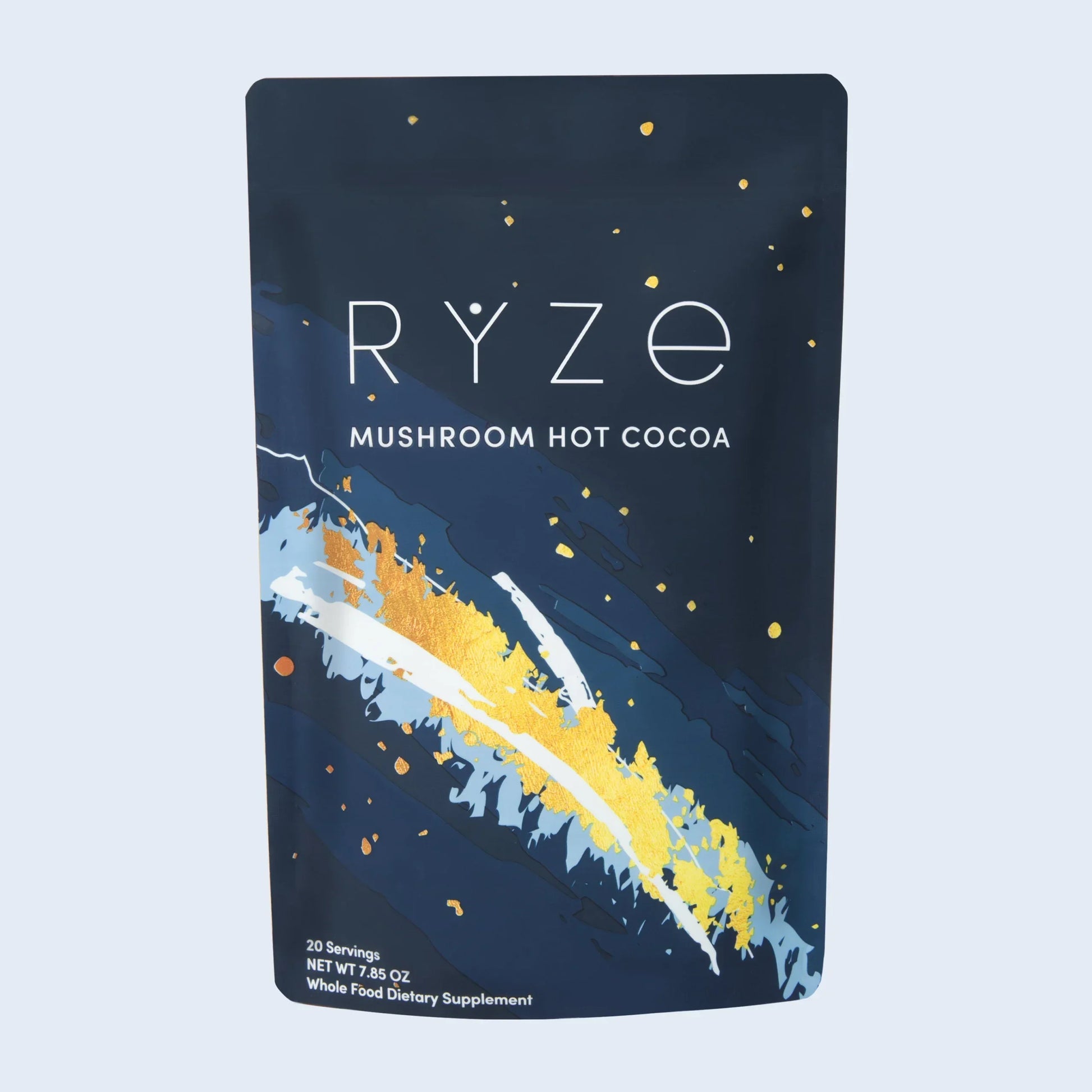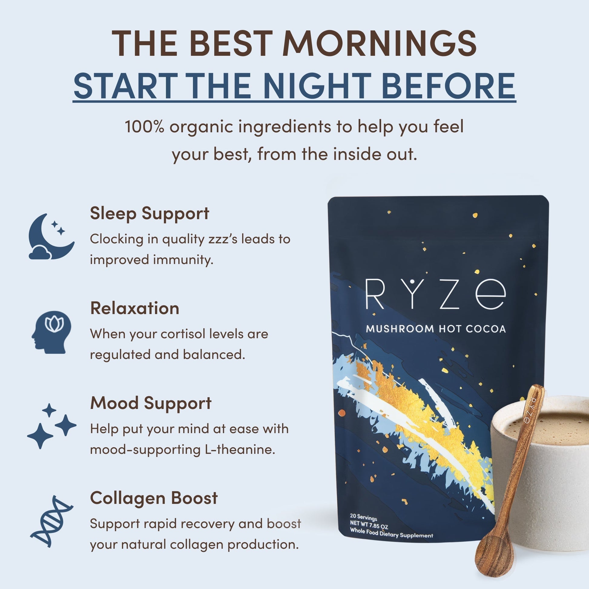 RYZE Mushroom Hot Cocoa. a nighttime treat that marries the magical calming powers of reishi with the snooze-inducing benefits of L-theanine. glycine and melatonin for a blend that helps you unwind at night and wake up refreshed in the morning. Blended with cacao powder for powerful antioxidants and coconut water for hydration. you'll start a better day the night before.